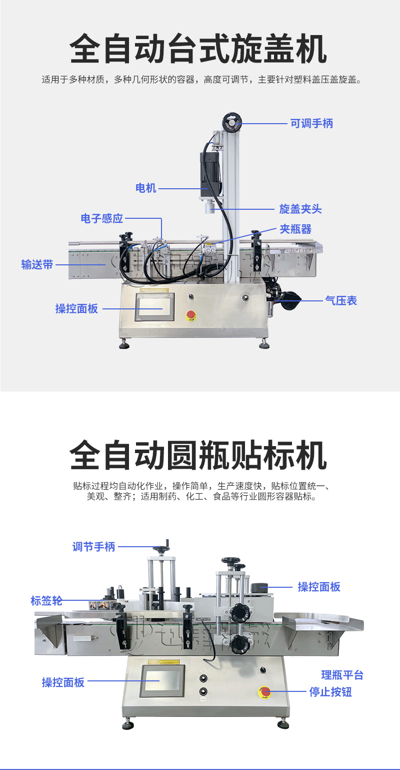 本設備主要適用于食品、日常化工、農藥、醫(yī)藥和特殊行業(yè)。灌裝精度將受氣壓的穩(wěn)定性、物料的均勻性、灌裝速度等的影響。 產品說明:生產線根據灌裝范圍選擇型號,灌裝部分為雙頭下潛式灌裝機,適用于不同物料不同瓶子的灌裝,配備自動壓蓋機和圓瓶貼標機,可實現不同蓋子的旋蓋貼標工作。